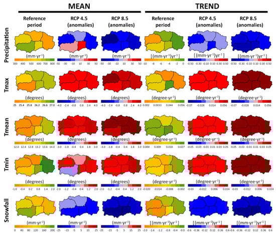 Regional distribution in Sierra Nevada of the mean annual values of the targeted variables in the study, together with their global mean trend during the 2006–2100 future study period for both RCP 4.5 and RCP 8.5 scenarios.