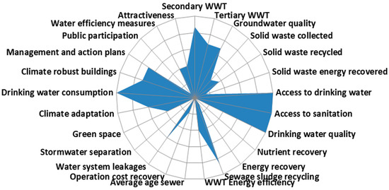 Spiderweb of the City Blueprint analysis of the city of Sabadell, Spain. The scores range from 0 (poor performance; centre of the circle) to 10 (high performance; periphery of the circle). The results are reported in detail in the study by Šteflová [30].