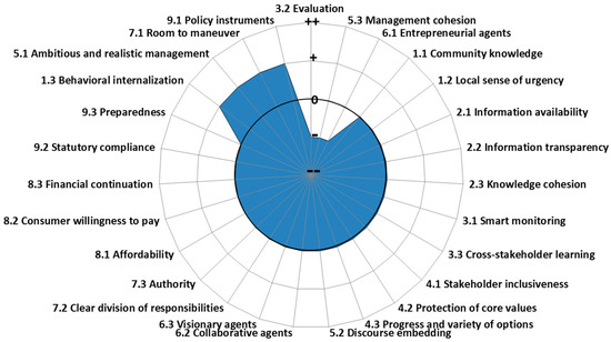 Results of the governance capacity to alleviate water stress by wastewater-reuse schemes in the city of Sabadell, Spain. The 27 indicators are organized clockwise around the spider web circle by most limiting (−−) to most encouraging (++).