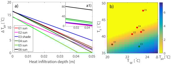43] measured an amplified cooling effect in the shade of trees for grassy areas. Their study, however, also reported an increase in temperature if the shade was provided by a mesh. Our experiment, in combination with the energy balance calculated by Equations (1) and (2), shows that, indeed, a better cooling performance is to be expected if the pavement is shaded.