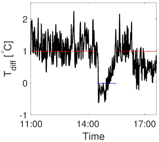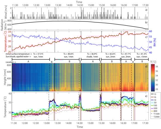 Figure 4e), the reference location was always warmer than the measurement location, even after a long measuring period (e.g., 13:20 until 14:20).