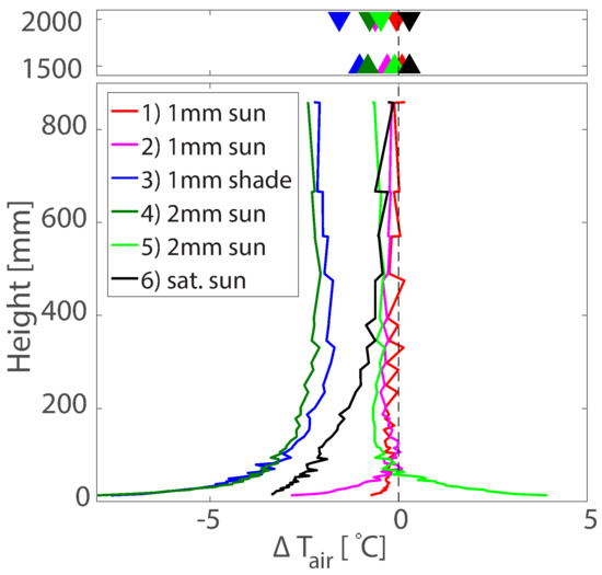 The amount of water applied did not show a clear relationship with the cooling effect. Applying 1 mm of water resulted in a relatively weak cooling effect, with the strongest cooling occurring near the ground. The strong cooling effect recorded after the fourth experiment using 2 mm of water, might suggest that double the amount of water leads to more cooling. However, the following experiment with 2 mm of water resulted in almost no cooling and even, an increase in temperature near the ground. The last experiment, when the surface was fully saturated by water, resulted in a slightly different profile than all previous experiments. It is possible that the amount of water influenced the thickness of the lower air layer that was experiencing stronger cooling than the higher, well-mixed air. The measured differences for small (1–2 mm) and large (>5 mm) amounts of water correspond with preliminary research done by [