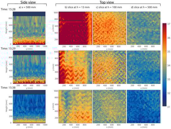 Figure 6b–d show the horizontal spatial variability of the temperature distribution before and after the fourth