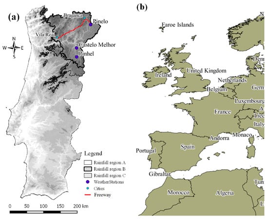 Location of (a) the highway “Auto-Estrada Transmontana” linking two Portuguese districts’ capitals (Vila Real and Bragança), three rainfall regions legally defined for Portugal by [], three weather stations within rainfall region B and (b) of Portugal in western Europe.