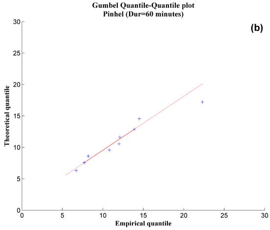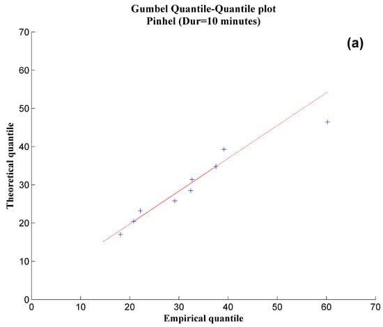 The quality assessment of the fit was also based on the analysis of the QQplots, which are the graphical representation of the theoretical quantiles as a function of the empirical quantiles. The closer the points are situated to the line of unit slope, the higher the quality of the fit, that is, the greater the confidence that the data fits a certain distribution []. As an example, the QQplots produced for the data observed in the weather station of Pinhel, for the durations of 10 min (Figure 2a) and 60 min (Figure 2b) reveals a linear and close distribution over the line . The high quality of the fit was confirmed for all series of maximum rainfall intensity, for each of the durations, for both the observed and simulated data, and all the 30-year periods corresponding to C20, B1 and A1B scenarios.