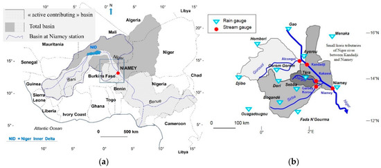 The area of the MNRB (Figure 1a,b) is one of the most studied in the West African Sahel because it is the major exorheic basin of the whole western and central Sahel, and because it includes long term stream-gauges stations. In the same MNRB, Cassé et al. [54] observed that the Upper Niger contribution has followed the climatic trend, and inversely, that “the local runoff contribution has been continuously increasing over the 1953–2012 period, which is paradoxical given the rainfall signal” ([54], p. 2853). The opposite evolution between upstream and downstream signals results in the progressive increase of the “red” flood since the 1980s.