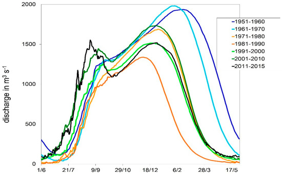 Although it is shorter than the other periods, the semi-decade of 2011–2015 could represent future MNRB behavior. The local Sahelian streams are flowing earlier and in increasing volumes due to the decrease in soil and landscape WHC. The Sudano-Guinean supply (the second flood) is increasingly separated, by a marked decrease in discharge, from the first one. It is also significantly shorter and smaller than during the wet decades of 1951–1970, as well as during the 2001–2010 decade, as a consequence of the observed pause in recovering rainfall in central Sahel and perhaps an increase in evaporation in the NID (Niger Inner Delta) due to the rising temperature.