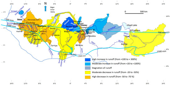 Slightly southward, in the Upper Bandama basin (Ivory Coast), a decrease of 16.5% in rainfall depths caused a 62% reduction in runoff at the Tortiya station during the 1970s and the 1980s [28].