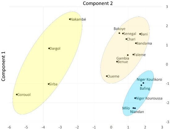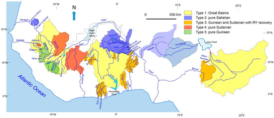 Figure 5 is a mapping of this regionalization by “hydrological” types. Its global pattern respects the zonal repartition between Sahelian, Sudanian and Guinean behaviors. It includes basins for which data are available in the literature. Eleven are described by Nka et al. [3], four by Opoku-Ankomah et al. [25], two by Amoussou et al. [27], one by Soro et al. [28], two by Amogu et al. [67], three by Badou et al. [59], one by Genthon (personal communication, 2017), and three by Mahé et al. [26] and Mahé and Paturel [9].