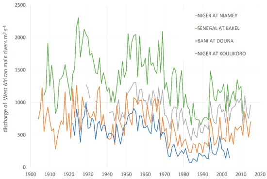 Due to works of Albergel in Burkina Faso [18], it is well established that in Sudanian regions, at the scale of small experimental catchments, discharges decreased during the drought. This was confirmed by several studies during the 1990s [64,65], and then synthesized at a larger scale by Olivry [20] for the upper tributaries of the Niger River, and finally by Mahé [66] and by Amogu et al. [67] on the Sudanian tributaries of the Niger River.