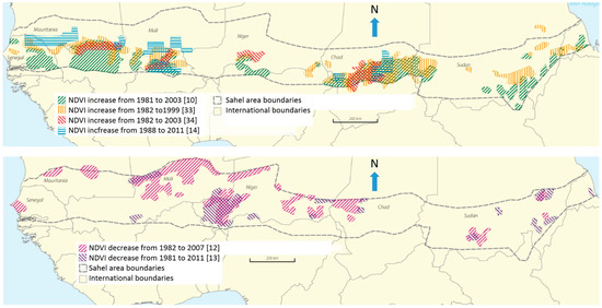 Overall, LULCC are characterized by greening, which is strongly linked to vegetation production. Two maps synthesizing the information were built in the more relevant and regional covering references published in recent years [10,11,12,13,14,33,34]. The maps are the synthesis of six sources documenting changes in NDVI metrics assessing annual vegetation production through the Sahelian strip [10,12,13,14,33,34]. For each source, the areas of increasing (vs. decreasing) NDVI (Normalized Difference Vegetation Index) are mapped.