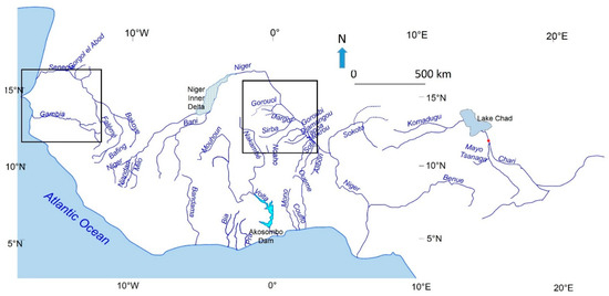 In a more Southern (Guinean) area, closer to the Gulf of Guinea, Opoku-Ankomah et al. [25] showed that discharges during the dry season have been the most impacted by the rainfall reduction since 1970: the discharge exceeding 95% in the dry season dropped from 71 to 17 m3·s−1 between the 1951–1970 and the 1971–1990 periods, respectively. These results concern four small basins located in a coastal area with a sub-equatorial regime (with two rainy seasons) covering 23,000 km2 (the Bia, Tano, Ankobra and Pra Rivers basins; Figure 3), with annual rainfall amounts ranging from 1500 to 2000 mm. In the Volta River basin, downstream from the Akosombo dam featuring one of the largest reservoir in the world, Oguntunde et al. [61] noticed that, between the 1931–1960 and the 1970–1998 periods, discharges of the Volta River decreased by 16%, for a 10% reduction of rainfall in the whole basin. This trend matches with the Great Drought, but also with the dam building, and the creation of the Volta Lake, which constitutes a big evaporation pan. Therefore, the trend may result from distinct but probably complementary causes.