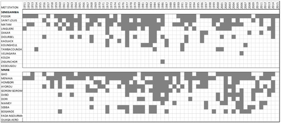- Analysis of daily rainfall is conducted in two areas: Senegambia and the Middle Niger River Basin (MNRB). In each one of the areas, a dozen raingauges are considered for the 1951–2015 period. They are homogeneously distributed in space; regionalization was processed using Thiessen polygons. Only the Menaka station (destroyed in 2013) presents data gaps.