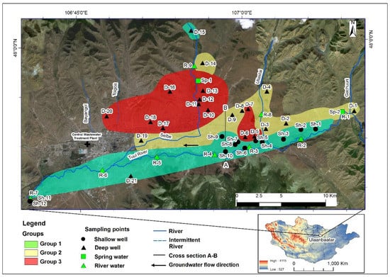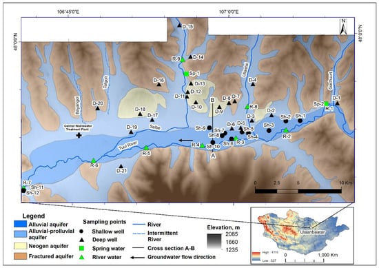 Hydrogeological map of Ulaanbaatar (UB) and the sampling locations (modified from a 1:200,000 hydrogeological map [10]).