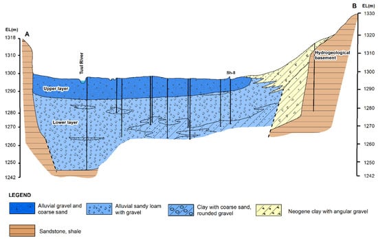 The alluvial aquifer is composed of sediments forming two unconfined layers, which differ primarily in composition, porosity, and water saturation (Figure 2). The upper layer consists mainly of unconsolidated gravel and boulders, and coarse sand fills the voids, representing 15–30% of the sediment by volume. The thickness ranges from 2 to 30 m (average: 25 m) and generally increases toward the center of the river basin [6,33]. The lower layer extends down to the Neogene and Carboniferous deposits, with a thickness ranging from 3 to 20 m. Its composition is similar to that of the upper layer, with occasional clay-dominant lenses. Fine silty sand and clay fill the voids between gravel and boulder particles and, in some areas, create clay layers ranging from a few centimeters to 5–8 m thick. Although the composition of the alluvial aquifer is generally uniform, the presence of clay-dominant soil with low permeability creates semi-confined conditions locally in some strata, where the lower layer of the aquifer yields less water compared with the overlying layer [32,34].