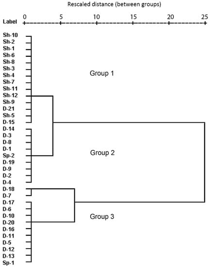 To delineate the spatial distribution of water quality based on the potential for NO3 pollution, we employed a hierarchical cluster analysis (HCA) [36,37] to identify groups with similar major ion compositions and field parameters. Figure 3 presents a tree diagram produced from the HCA, which divides the samples into three groups. Most shallow groundwater samples from the alluvial aquifer were clustered in Group 1 (Sh-1–Sh-12, D-15, and D-21). Group 2 included spring water (Sp-1) and bedrock groundwater (D-1, -2, -3, -4, -8, -9, -14, and -19). Finally, Group 3 accounted for the remaining bedrock groundwater and spring samples (D-6, -7, -10, -11, -16, -17, -18, -20, and Sp-1).