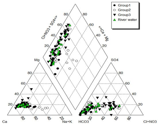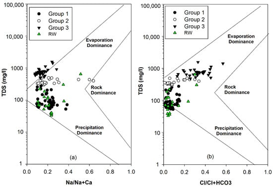 Based on Gibbs’ [41] plots (Figure 4), water–rock interactions appeared to be the major mechanism controlling the hydrochemistry of water in UB for shallow alluvial aquifer and bedrock aquifer groundwater, as well as river water. All resources had similar Na/(Na + Ca) ratios; however, they were clearly differentiated based on the TDS concentrations, which were higher for resources with longer residence times. Group 1 groundwater and river water samples were characterized by similar ranges of TDS, Na/(Na + Ca), and Cl/(Cl + HCO3), implying vigorous interchange. TDS and Cl/(Cl + HCO3) values for groundwater samples showed increasing trends from Group 1 to Groups 2 and 3.