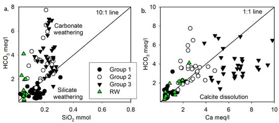 Assessment of the dominant water–rock interactions of the water samples plotted based on (a) HCO3 vs. SiO2 and (b) HCO3 vs. Ca2+ concentrations.