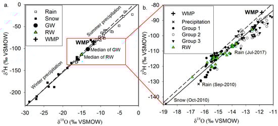 δ18O and δ2H values of water in the study area: (a) precipitation from 1990 to 2001 (data obtained from [35]) and (b) water sample groups of this study from 2010 to 2017. WMP indicates the weighted median precipitation of UB, and the Global Meteoric Water line (GMWL) and Local Meteoric Water line (LMWL) are presented as solid and dotted lines, respectively. GW and RW denote groundwater and river water, respectively.