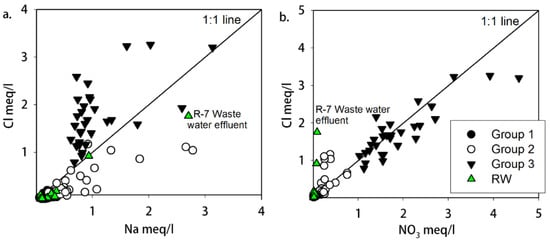 Groundwater NO3 sources were delineated based on the hydrochemistry of the water samples. Figure 9a presents the Na versus Cl concentrations of the water samples, where a slope of 1:1 indicates that Na and Cl originate from meteoric sources [53]. Most surface water samples and Groups 1 and 2 groundwater samples were plotted below the 1:1 slope line, indicative of excess Na ions from the geological matrix. Silicate mineral weathering could account for the additional Na in the surface water and Group 1 groundwater (Figure 7a) [58]. Meanwhile, for Group 2 groundwater, dominated by carbonate weathering, cation exchange processes could account for the additional Na from the geologic matrix via Ca substitution (Figure 7b). By contrast, the excess Cl concentrations in Group 3 groundwater appeared to originate from the same sources as NO3 (Figure 9b).