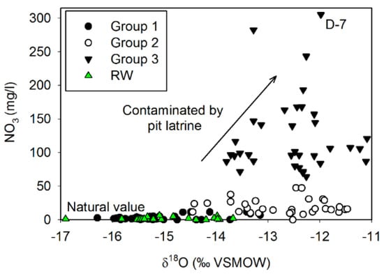 During the rapid development of UB over the last decade, population growth has surpassed that of the city’s infrastructure, and Ger districts have expanded to surround the city center. Given the lack of proper infrastructure (e.g., pipeline water-distribution systems and sewage disposal systems), groundwater wells, such as those in Groups 2 and 3, have become the main sources of water for residents through water kiosks. At the same time, the groundwater developed along the slope areas has become threatened by contamination sources, including unmanaged pit latrines and septic tanks [55]. The correlation between high NO3 concentrations and heavier isotopic values in groundwater (Figure 10) indicates that these sources could become contaminated in the Ger districts. Ultimately, contaminated groundwater from the upslope recharge area flows downward toward the discharge area, the Tuul River, slowly and steadily expanding the region impacted by contamination to the riverbank alluvial aquifer, threatening the shallow groundwater, which is the major water supply for the city center.