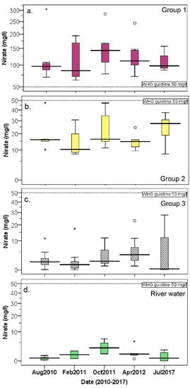 Box plot showing the NO3 (mg/L) concentration (including the standard deviation, minimum, maximum, and median values) during sampling campaigns from 2010 to 2017. NO3 concentrations are presented on a power of the exponent scale (0.5); (a) Group 3, (b) Group 2, (c) Group 1, and (d) River water, respectively. “*”, “o” denotes outliers.