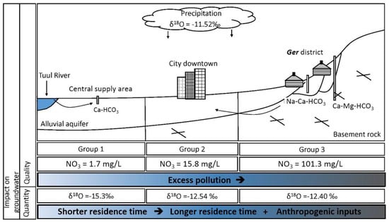 Figure 12 presents a schematic diagram of the groundwater system and its relation to NO3 contamination of water resources. The hydrochemical characteristics and stable isotope ratios of water samples indicate that groundwater flows from the upslope area to the downslope city center toward the Tuul River through the alluvial aquifer. As the groundwater moves downward, it could carry NO3 from anthropogenic sources, slowly and steadily spreading contamination. Although Group 2 groundwater in the nearby city area has NO3 levels below the guideline of 50 mg/L, its water quality will likely deteriorate in the future and warrants continuous monitoring.