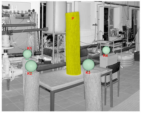 Scan of the trunk (P) with the four reference balls (K); photogrammetric image of point cloud intensity.