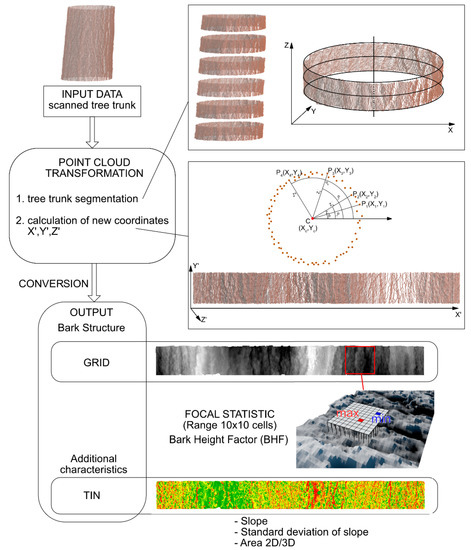 In order to calculate bark characteristics of the tree trunks GIS tools were used. The idea was to use similar techniques as in physiography studies to describe terrain roughness with Digital Terrain Models but on the micro scale. In order to achieve this, the input data, in the form of point clouds of scanned tree trunks, should be unwrapped to a 2.5D surface. The TTBSM was created to make this time-consuming process fully automated. The scheme of the model processing is shown in Figure 2.