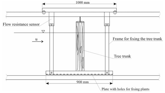 Measurements were carried out in a laboratory in a hydraulic trough with 12 m in length, 0.47 m in width, and 0.9 m in height. The trough was flooded with water in a closed system with the maximum flow rate of 120 L∙s−1. The trough filling was controlled by a lid at one end of the trough. The measuring system was equipped with an electromagnetic flow meter and an electronic sensor of the water level. In the trough there was a dynamometric platform connected to a tensometric sensor capable of measuring tangential and stretching forces in the range up to 0.05 kN (Figure 3). Moreover, water temperature and speed of water reaching the tree trunk were measured using a micro ADV probe. Measurements were made for 11 different mean flow values from the range 0.1–0.7 m∙s−1 for two variants of the experiment: for the natural trunks and for the trunks wrapped in foil. Each measurement was repeated twice.
