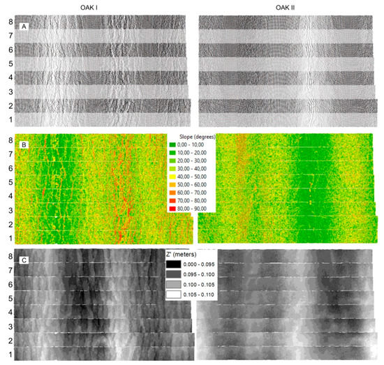 The transformed point clouds were used to make digital models of tree trunk surfaces in the TIN (Triangulated Irregular Network) format using the program ArcGIS with the 3D Analyst extension. On the basis of the digital models of surfaces of natural and foil-wrapped tree trunks, made for segments 0.05 m in height, the average slope, standard deviation of slope and ratio of 2D to 3D area were calculated using the standard tools available in the ArcGIS environment. The additional bark characteristics used—average absolute slope, standard deviation of slope, and the ratio of 2D to 3D area—are commonly used for description of surface morphometric characteristics. Average absolute slope is the arithmetic average of the absolute value of slope calculated in 0.05 m segments of tree trunk. Standard deviation of slope is the sum of the squared deviation of each individual slope rate from the average absolute slope. The 2D area is calculated from a top orthographic view and 3D area takes into account 3D characteristics of the surface. A 3D surface with many peaks and valleys will have a larger 3D surface area than a plan view representation of the same area in 2D. It was assumed that the same parameters could be used for characterization of tree trunk bark surfaces. The parameters used in this work results from the ASME B46.1-1995 [].