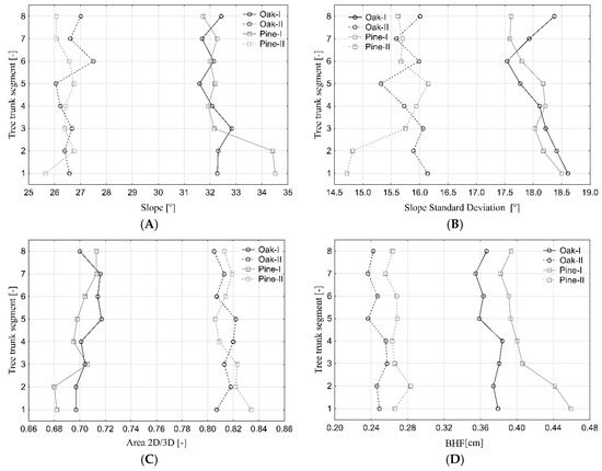 Changes in the slope (A); standard deviation of slope (B); 2D to 3D area ratio (C) and BHF (D) along the trunks of oak and pine trees.