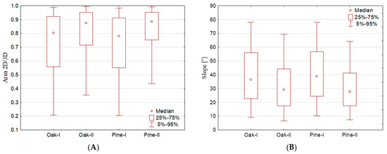 Analysis of bark structure characteristics of the foil-wrapped tree trunks, performed over segments of 0.05 m, revealed the greatest differences in the bottom parts of the trunks. The analysis indicate the greatest differences between the average slopes (Figure 6A) and 2D to 3D area ratios (Figure 6C) in segment no 1 and slope standard deviations in segments no 1, 2 and 5 (Figure 6B). The analysis of BHF for both foil-wrapped tree trunks indicate that for pine the values were slightly higher than in oak from 0.01 to 0.03 cm. The greatest differences were observed in segment no 2 (Figure 6D). The analysis of pine and oak trunks indicate the greatest differences between average slope, 2D to 3D area ratio and BHF were observed in their bottom segments no 1 and 2. The most uniform was the surface of the oak tree trunk, characterized over the whole length by the lowest variation in the slopes, 2D to 3D area ratios and BHF (Figure 6). For pine tree, the greatest BHF was noted in the bottom part of the trunk. The 2D to 3D area ratios for oak tree trunks proved that the difference between 2D and 3D area was up to 45% (percentile of 75%) for the natural tree trunk and 28% for the trunk wrapped in foil. For the pine tree the analogous difference was 48% and 26% for the natural and foil-wrapped trunk, respectively. For the tree trunks wrapped in foil, the 2D/3D area ratio in the percentile range 25–75% varied from 0.72 to 0.96, while for the natural trunks it varied from 0.55 to 0.93 (Figure 7A). The slope values in the percentile range 25–75% varied from 23 to 55° for the natural tree trunks, while for the foil-wrapped trunks the values were lower and varied from 17 to 43° (Figure 7B). The Kruskal–Wallis rank test indicate the statistical significant differences between medians of BHF and other bark characteristics for pine and oak natural and wrapped in foil trunks. Differences were significant at level of 0.05.