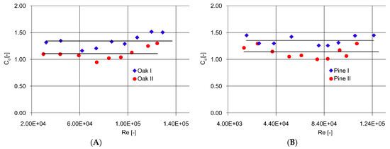 Flow resistance coefficient versus Reynolds number Re for oak (A) and pine (B).