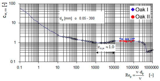 The experimentally determined coefficients of flow resistance for the tree trunks wrapped in foil take values similar to that obtained by Schlichting and Gersten [], which was = 1.1, for smooth tree trunks for the Reynolds number 3·104 < < 105 (Figure 9 and Figure 10). The natural trunks, both oak and pine, achieved larger values of . This shows that not taking into account the bark characteristics may lead to underestimating of and further on lowering the value of friction factor (Equation (1)). The figures also show that the conducted research covers only on certain range of values. However, it is particularly interesting from the point of view of average conditions occurring during floods when water may flow in areas covered with trees (velocities 0.1–0.5 m/s).