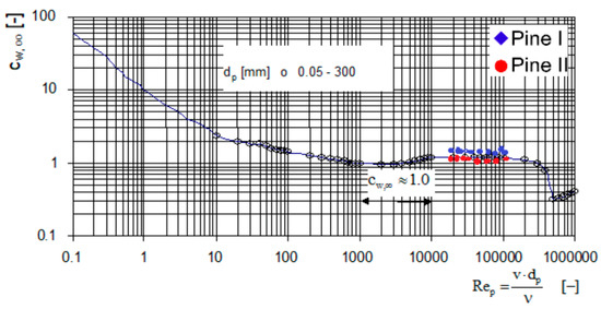 In the same paper [], it was assumed that the contribution of the tree trunk roughness to the total flow resistance of a smooth cylinder is 11%, so it can be neglected; however, the laboratory tests performed by us indicated that this contribution is much greater and reaches 20%. Similar results were obtained by Ruck et al. [], who studied the flow around the cylinder with increased roughness. The used roughness varied according to the layer thickness of balls coated on the cylinder. Three different layer thicknesses were tested: 3, 5, and 10 mm. For both experimental series, the Reynolds number was systematically varied in the range from 1.0·104 to 1.3∙105. The drag coefficients obtained in research seem to be quite constant in the investigated range of Reynolds numbers. The drag coefficients of the fully coated cylinders are 15–25% higher than for the smooth cylinder. Obviously, the drag increases with increasing layer thickness. Values obtained in our research for natural stems were similar for BHF ranging from 3 to 10 mm. This confirmed the importance of this parameter on the coefficient of resistance to the flow of tree trunks.