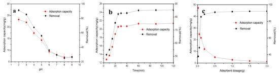 With the increase of TAC dosage from 0.02 to 0.5 g, the removal efficiency of Cr increased from 36.97 to 90.01%, but the adsorption capacity decreased from 46.21 to 4.50 mg/g, respectively (Figure 1c). The increased removal ratio could be attributed to the increase of active adsorption sites and the surface area of TAC due to the increasing carbon dosage. But, Cr removal did not reach 100%, indicating that saturated adsorption occurred, and adsorption and desorption coexisted in the system. On the other hand, the decreased sorption capacity of Cr was probable due to the reduction in both the effective surface area and adsorbate/adsorbent ratio, caused by the coagulation of TAC particles with the increase of TAC content in a given volume of solution and thus the increase of diffusion distance of adsorbates on the surface or inside adsorbents []. Taking account of both adsorption capacity and removal rate of Cr, the amount of adsorbent for further adsorption experiments was 0.1 g (2 g/L).