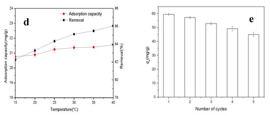 When the initial solution temperature increased from 15 to 40 °C, the adsorption capacity of Cr increased from 20.56 to 21.50 mg/g, and the removal rate increased from 41.11% to 85.99% (Figure 1d). The increasing temperature helped the dehydration of Cr(VI) ions, increased the Brownian motion of Cr(VI) ion and sorption sites on the TAC surface, decreased the thickness of the double electric layer of TAC, and thus enhanced the sorption of Cr(VI) onto TAC [,,].