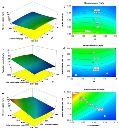 3D surface mapping and contour plots for combined effects of (a,b) pH and carbon dosage (C0 = 50 mg/L, t = 120 min, T = 25 °C); (c,d) pH and initial concentration (m/V = 2.0 g/L, t = 120 min, T = 25 °C); and (e,f) carbon dosage and initial concentration (pH = 3.0, t = 120 min, T = 25 °C) on Cr adsorption capacity on Typha angustifolia activated carbon.