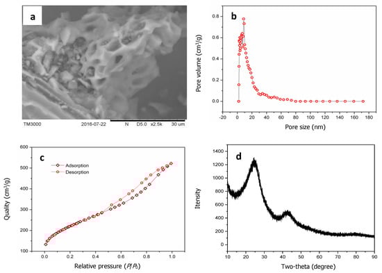 The external surface morphology of TAC was full of cavities of different size and shape (Figure 3a). As shown in Figure 3b,c, the N2 adsorption/desorption isotherm curve showed hysteresis loops in the relative pressure (P/P0) range, indicating that the TAC structure was mesoporous. The specific surface area, total volume pore, and average pore diameter was 789.32 m2/g, 0.81 cm3/g, and 4.09 nm, respectively. The internal pore structure of TAC examined by XRD exhibits that two broad peaks were observed near 2θ = 24° and 43°, which correspond to the (002) and (100) reflections, respectively (Figure 3d). The developed pores on the TAC surface could result from the evaporation of H3PO4 activator during carbonization. The occurrence of broad diffraction peaks at 2θ was an indicator of an increasing regularity of crystal structure caused by carbon in TAC and better layer arrangement []. The crystallization degree in the TAC depended on the chemical compositions of a high proportion of C in TAC []. The mesoporous nature was considered helpful for the accessibility of Cr(VI) to the surface of TAC, and the good physical characteristics helped the physical adsorption of Cr(VI) onto TAC, and the subsequent ion exchange, complexation, and reduction for Cr removal [].