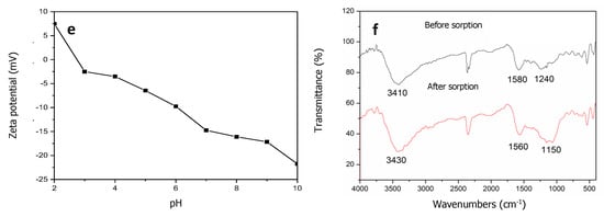The pH of the isoelectric point (pHIEP) is an important chemical characteristic for adsorbents. The zeta potential of the TAC decreased with the solution pH, and the pHIEP of TAC was found to be at pH 2.80 (Figure 3e). When the solution pH was lower than the pHIEP, the surface of TAC was net positively charged and easily electrostatically attracted Cr(VI) oxyanions. Conversely, the negatively charged TAC surface would hinder the adsorption of Cr(VI).