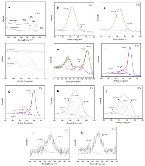 X-ray photoelectron spectroscopy of Typha angustifolia activated carbon: (a) whole; (b) and (c) high resolution P2p; (d,e) Cr2p; (f,g) C1s; (h,i) O1s; and (j,k) N1s spectra before and after adsorption, respectively.