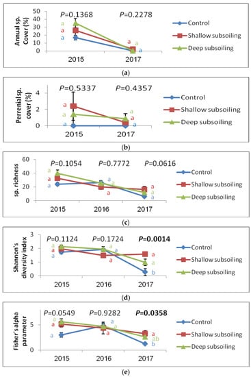 Similar to the trend for vegetation cover, the shallow and deep chiseling treatments faced a decreasing trend throughout the three-year study period for each of the means of species richness (Figure 2c), Shannon’s diversity index (Figure 2d, despite a minor exception for the shallow chiseling treatment in 2017), and Fisher’s alpha parameter (Figure 2e). At the same time, the control plots faced—for each of these variables—a slight increase between 2015 and 2016, and then a sharp decrease between 2016 and 2017. However, mostly, the treatment effect on means of these variables was not significant. The only exceptions were recorded for the Shannon’s diversity index in 2017, where means under the two chiseling treatments were significantly greater than those under the control plots; and for the Fisher’s alpha parameter, where mean under the shallow chiseling treatment was significantly greater than that under the control plots (and the deep chiseling treatment taking place between them). For each of the last three parameters, means under the deep chiseling treatment were slightly greater than those under the shallow chiseling treatment in 2015 and 2016, while an opposite state was recorded for 2017. This suggests a slight advantage for the deep chiseling treatment under a high-to-normal precipitation regime, and a slight advantage for the shallow chiseling treatment under an extremely low precipitation regime. However, a much longer period of study is needed to verify this observation.