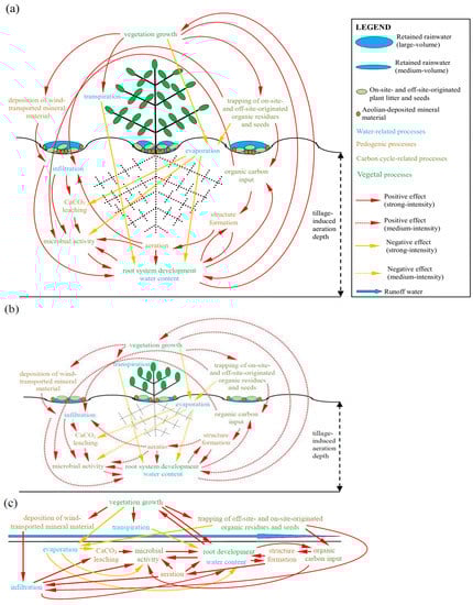 In the no-tillage, control plots, the surface smoothness limits the deposition of fine mineral materials and organic residues and seeds originating off-site []. Also, the surface smoothness hinders the on-site retention of raindrops. Coupled with the compaction-induced limited soil aeration [] and diminished water infiltrability [], these processes cause the generation of intensive runoff of water []. Further, the low infiltrability of water diminishes leaching of calcium carbonate [], and hinders microbial activity []. The no deposition of organic residues allows high evaporation rates [], and enables no input of organic matter to the soil organic pool, with the resultant small macro-aggregate formation, and low available water capacity [,]. The combined effects of these processes allow no germination and establishment of plants, with the resulting retardation of self-restoration processes (Figure 3c).