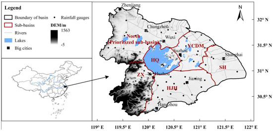 The TLB, located in the southern part of Yangtze River Delta, China (within 119°3′1″–121°54′26″ E, 30°7′19″–32°14′56″ N), has a typical humid sub-tropical monsoon climate, with the annual mean rainfall of about 1177 mm. The area of the basin is around 36,500 km2, which is definitely a rather large one. Figure 2 depicts the relative geographical location of TLB and its seven sub-basins which are divided according to terrain and flood control needs. The area of North, YCDM, SH, HJH, HQ and ZX is 11,510, 4314, 4466, 7480, 3192 and 5930 km2, respectively. As is revealed from the elevation, the TLB shows a high altitude in the West mountainous area while the rest is basically plain areas.