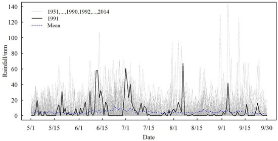 Comparison of daily rainfall during flood season in 1991 and other years.