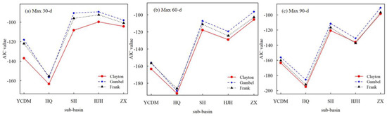 AIC values of fitting for extreme rainfall by 3 types of 3-dimensional Copulas. (a) Maximum 30 day; (b) Maximum 60 day; (c) Maximum 90 day.