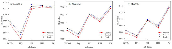 OLS values of fitting for extreme rainfall by 3 types of 3-dimensional Copulas. (a) Maximum 30 day; (b) Maximum 60 day; (c) Maximum 90 day.