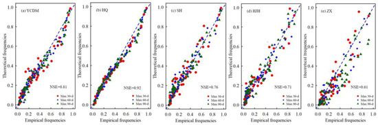 Scatterplots of theoretical-empirical frequencies fitted by 3-dimensional Clayton Copulas. (a) Sub-basin YCDM; (b) Sub-basin HQ; (c) Sub-basin SH; (d) Sub-basin HJH; (e) Sub-basin ZX.