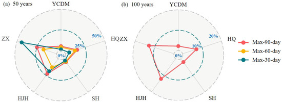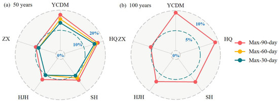 For rainfall of a 100 years return period, there still exists pretty huge gaps among probabilities, the probabilities of HJH and ZX are 12.29% and 12.96%, while YCDM and HQ are 2.26% and 2.04%. Moreover, it is seen that the probabilities decrease in general from 50 years return period to 100 years return period, this is comprehensible since it always becomes less probable to encounter a larger quantity of rainfall. In order to make a comparison straightforwardly among the possibilities, radar plots are shown in Figure 7. It is clearly seen that the shapes of radar plots are quite irregular.